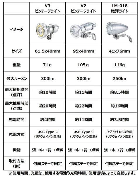※使⽤時間、光量は充電時間や使⽤環境によって変動します