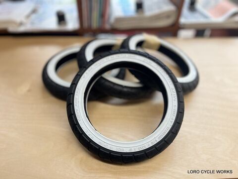 キャリーミーのホワイトリボンタイヤです。 SEic用ではありますが、もちろん従来のCARRY MEにも装着可能。 サイズ表記は8x1-1/4 空気圧は90PSI(6.2bar)です。
