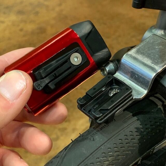 ※フロントブレーキ部分のリフレクターを外して、代わりに取り付けできます。フロントバッグにも干渉せずスマートに取り付け出来ます。