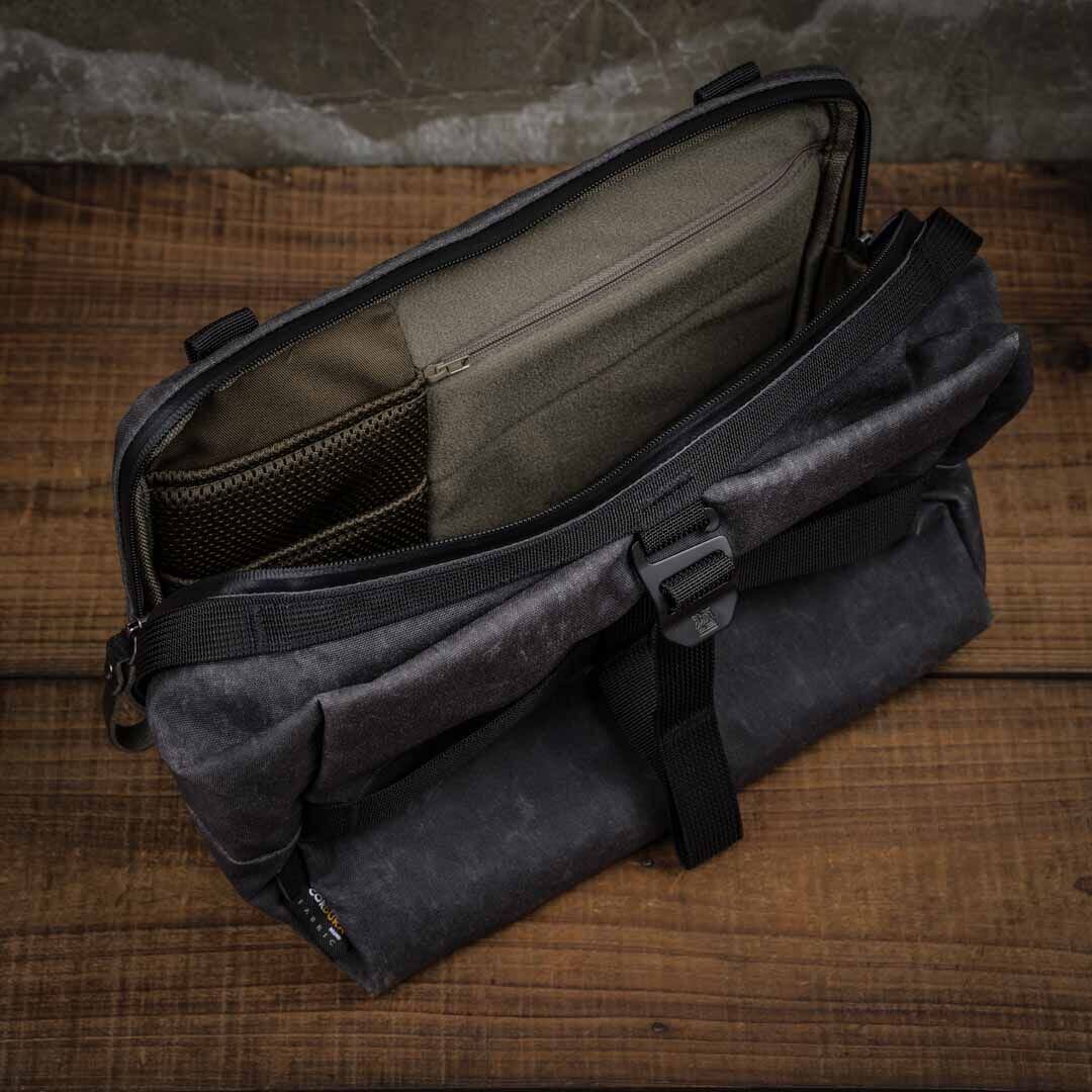 バッグの正面にある二つのバンドにより、容量を最大 8.5 リットルまで調節可能です。