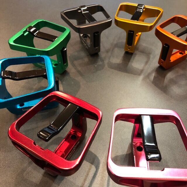 BROMPTONフレームの前にある専用マウントに取り付けてフロントバッグなどを取り付けるためのアダプタです。上部、ボタンでロック解除が出来ます。アルミの一体成型により構成されるパーツ点数が少なくい為、軽量に仕上がっております。