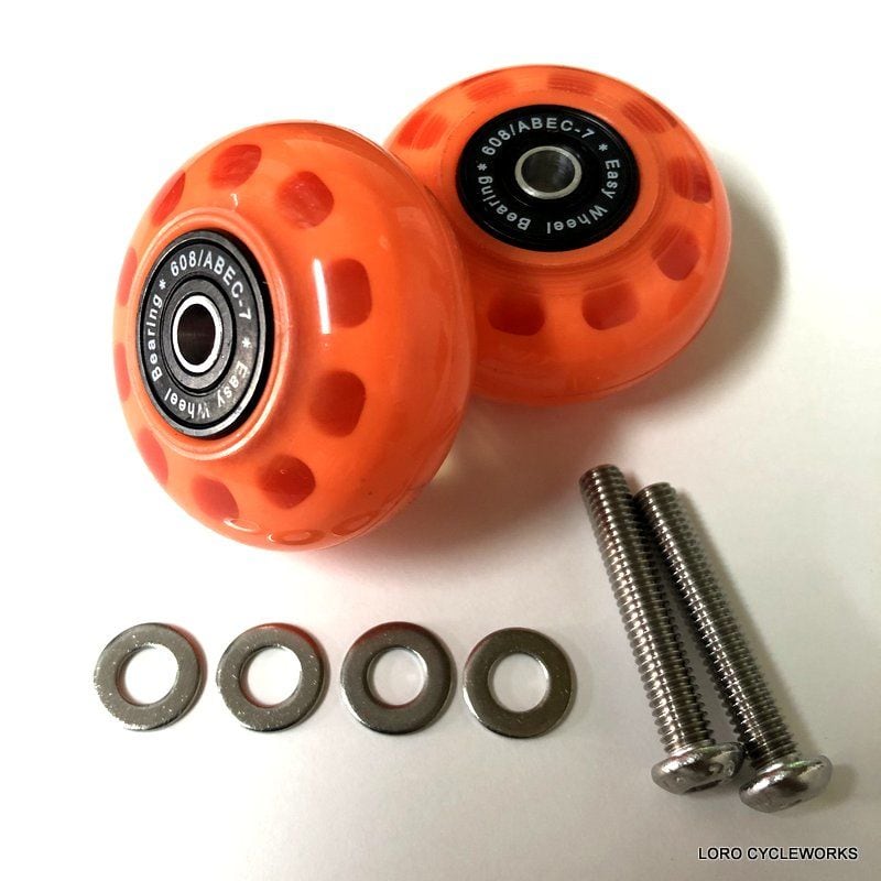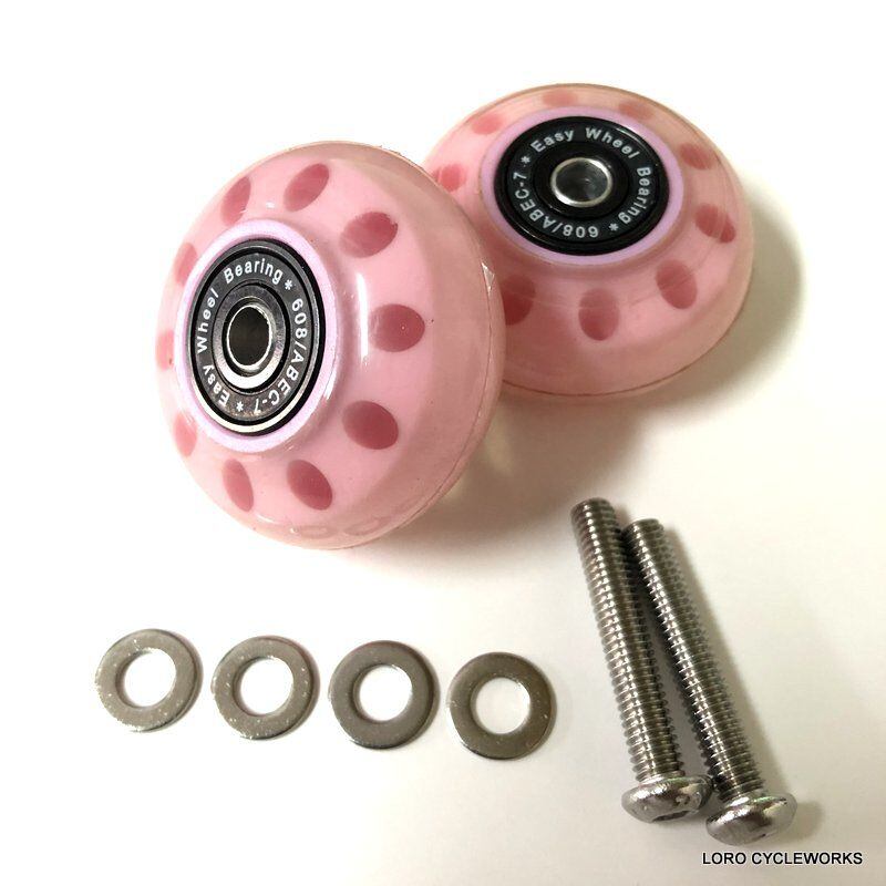 ベアリング内蔵の純正キャスターホイール。 転がりと振動が改善されます。 左右ペア1台分のセット販売です。 ボルト&ワッシャー付属 ベアリング:608/ABEC7 直径:48ミリ