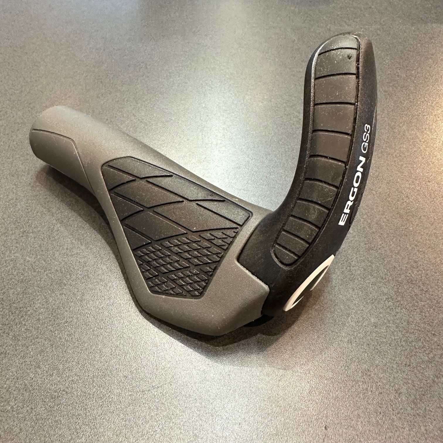 パワフルなライディングに最適な、滑り止め加工が施されたグラスファイバー製バーエンド付モデル、GS3。 グラスファイバー コンポジット バーエンド。 サイズ(太さ):S、L 長さ:143mm バーエンド長 (芯から先端まで):89mm 重さ:245g / ペア (L)