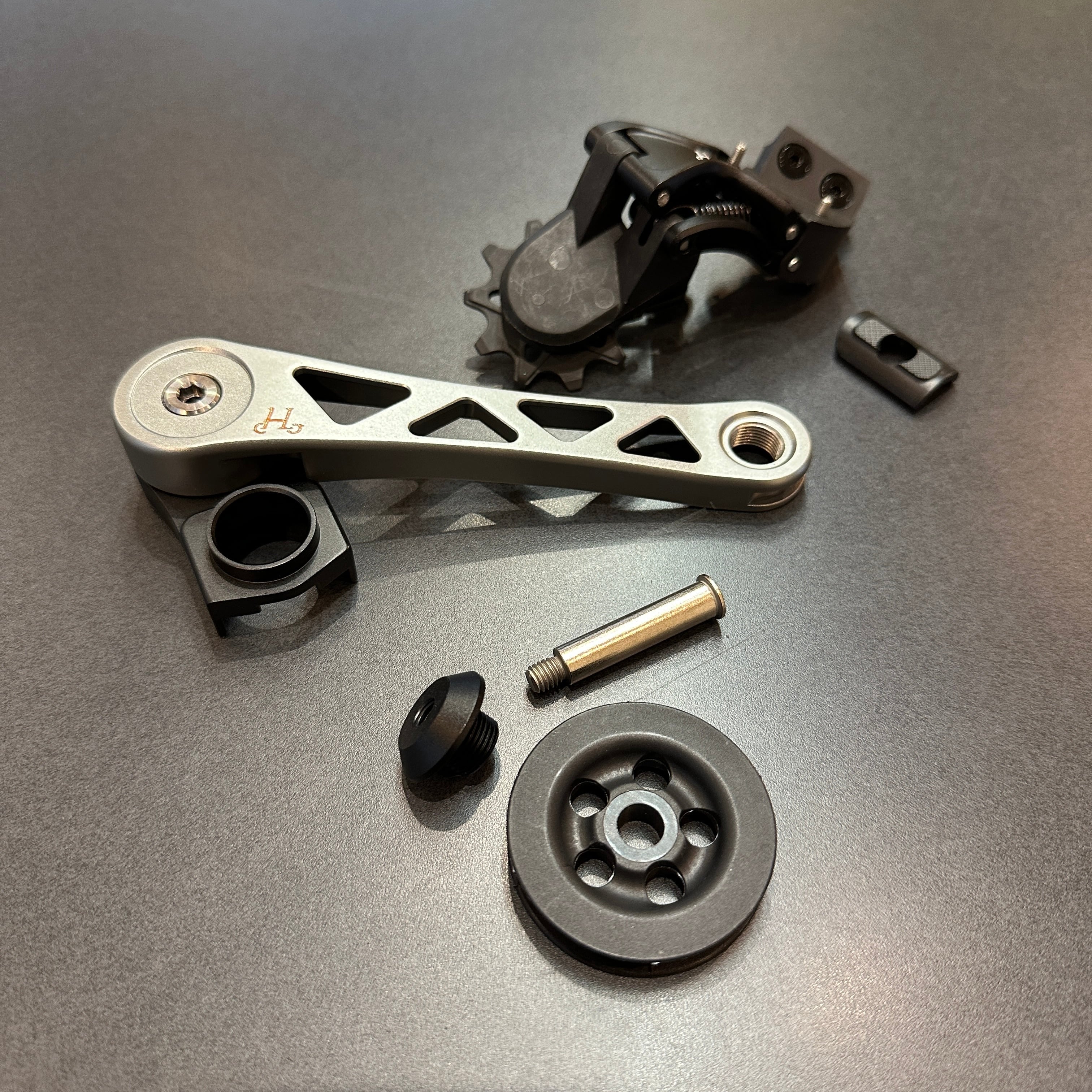 Brompton C-Line用の外装多段化、 テンショナーとプーリー、ディレイラーのセット☆ ディレイラーに当たる部分はP-Lineと同じ仕組みのParallelogramタイプ。 テンショナーアームは軽量加工が施されたアルミ製。 外装7段にまで対応しております。 Tensionerカラー:Silver Derailleurカラー:Black