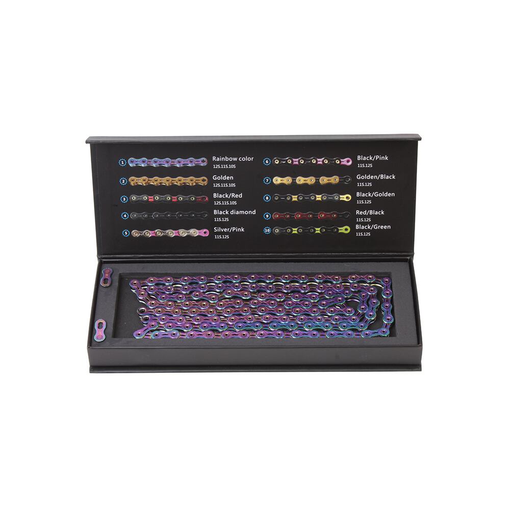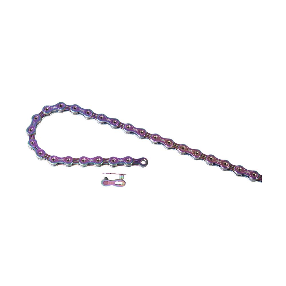 11速用チェーン アウタープレート、インナープレート、ピンが中空構造になっており軽量 卓越した耐久性と、高速かつスムーズな変速 サイズ:1/2″ x 11/128″ 116リンク 重量:243g