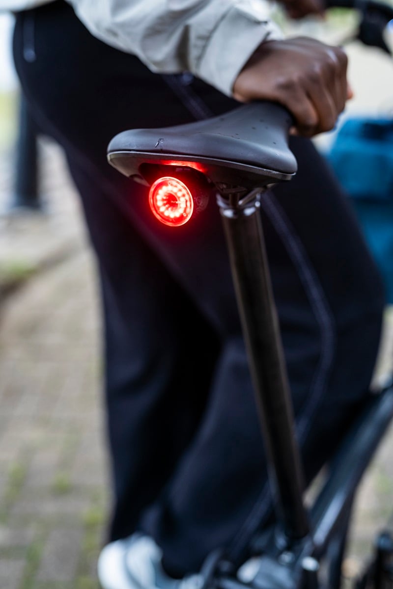 フロントライトとリアライトのセットになります。専用のアタッチメント部品でフロントはブレーキレバーマウント(現行ブレーキレバータイプ)に、リアはブロンプトン純正サドルに装着ができ、折り畳み時にも干渉することなく充電時の着脱も簡単に行える。