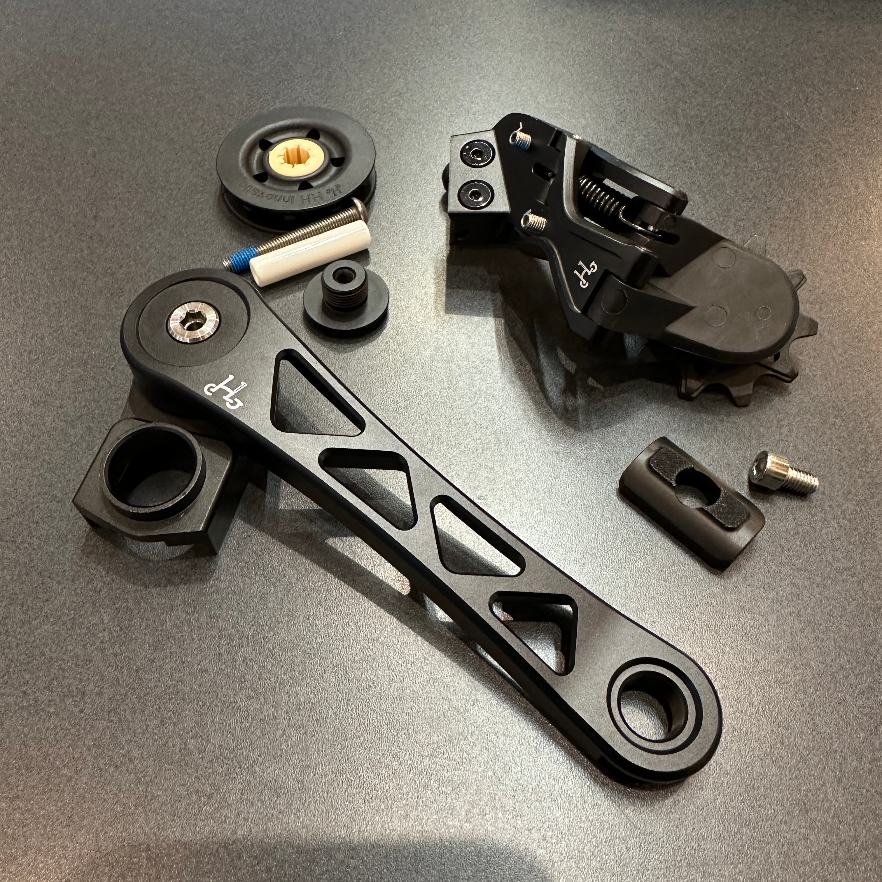 Brompton C-Line用(旧フレーム)の外装多段化、 テンショナーとプーリー、ディレイラーのセット☆ ディレイラーに当たる部分はP-Lineと同じ仕組みのParallelogramタイプ。 テンショナーアームは軽量加工が施されたアルミ製。 外装7段にまで対応しております。